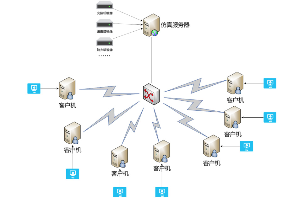 • 高配置的服务器采用虚拟化技术,进行网络设备仿真。